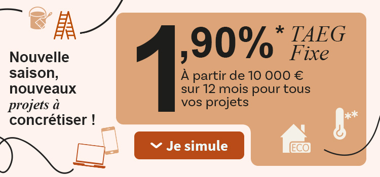 *Exemple, hors assurances facultatives : pour un prêt personnel d’un montant total de 10 000€ : vous réglez 12 mensualités de 841,86€. TAEG fixe de 1,90%. Taux débiteur fixe : 1,88%. Coût du crédit : 102,32€. Montant total dû : 10 102,32€. Durée du crédit : 12 mois. Coût mensuel de l’assurance pour DIM+CHOM (s’ajoute à votre mensualité) : 19,80€. Coût total de l’assurance pour DIM+CHOM : 237,60€ soit un TAEA (Taux Annuel Effectif de l’Assurance) de 4,50%.